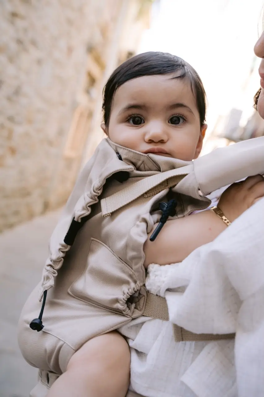 From the first days of life, this carrier ensures safe positioning. Keeping the baby close to your chest prevents chin-to-chest compression, supporting healthy breathing. Side drawstrings and PFAs allow for fine adjustments to match your baby’s developmental stage.